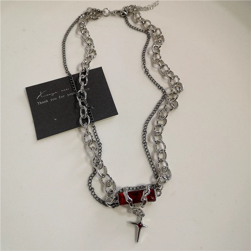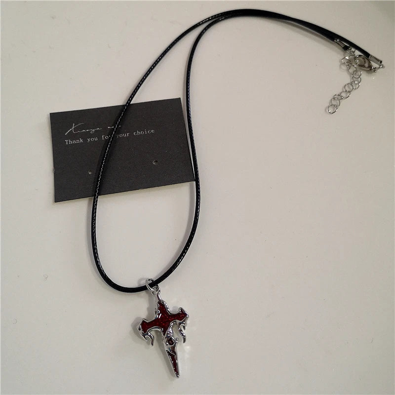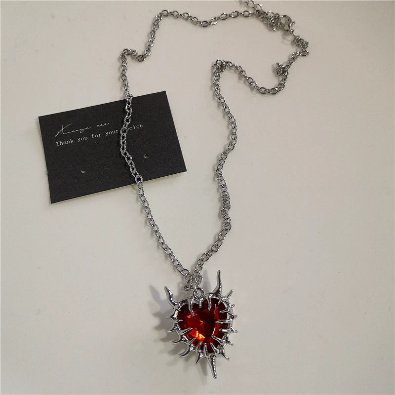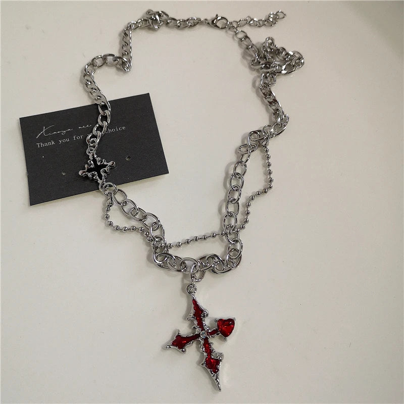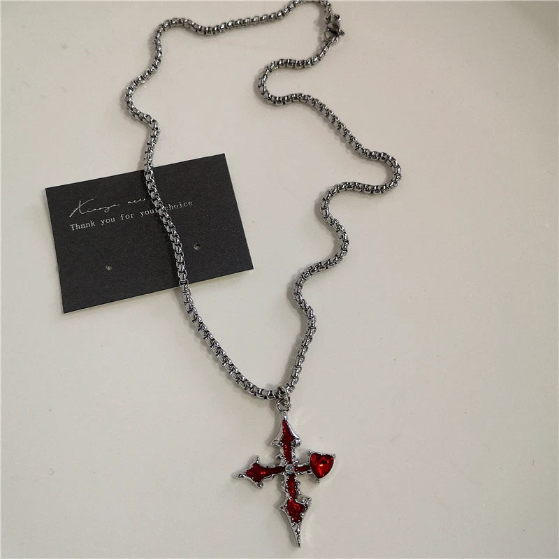 Gothic Red Heart Thorns Cross Chains Necklace – Hip-Hop Grunge Punk Y2K Jewelry for Women & Men