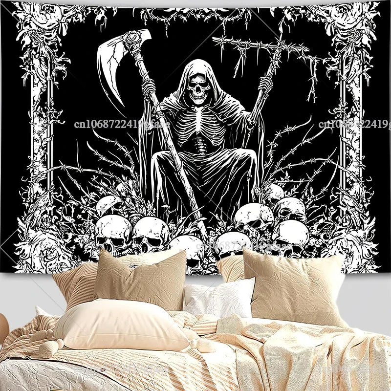 Gothic Skull Tapestry – Black & White Skeleton Wall Hanging for Halloween & Room Decor