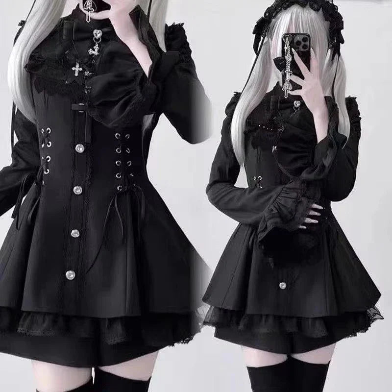 Japanese Gothic Lolita Dress Set – Harajuku Y2K Bow & Lace Mini Dress for Women