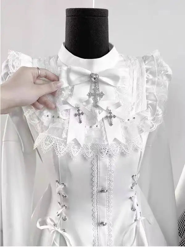 Gothic Lolita style with elegant collar, lace trim, and layered ruffles