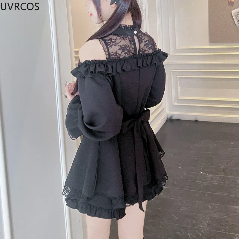 Japanese Gothic Rhinestone Bow Dress & Shorts Set – Lolita Y2K Off-Shoulder Outfit for Women